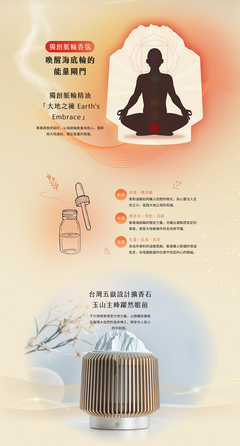 獨創「海底輪香氛」,搭配《大地之擁》精油配方,讓夜晚更穩定、更深沉。